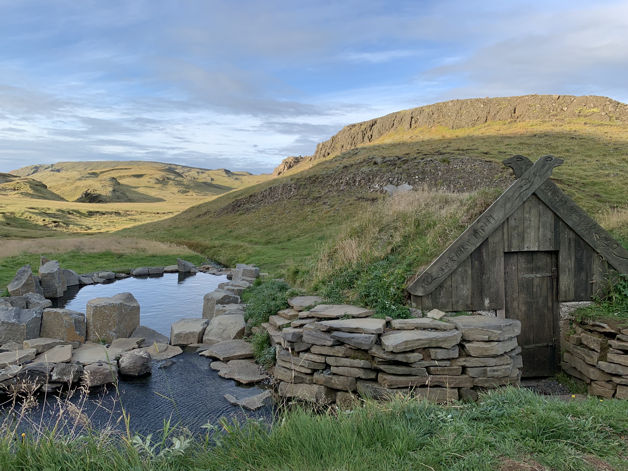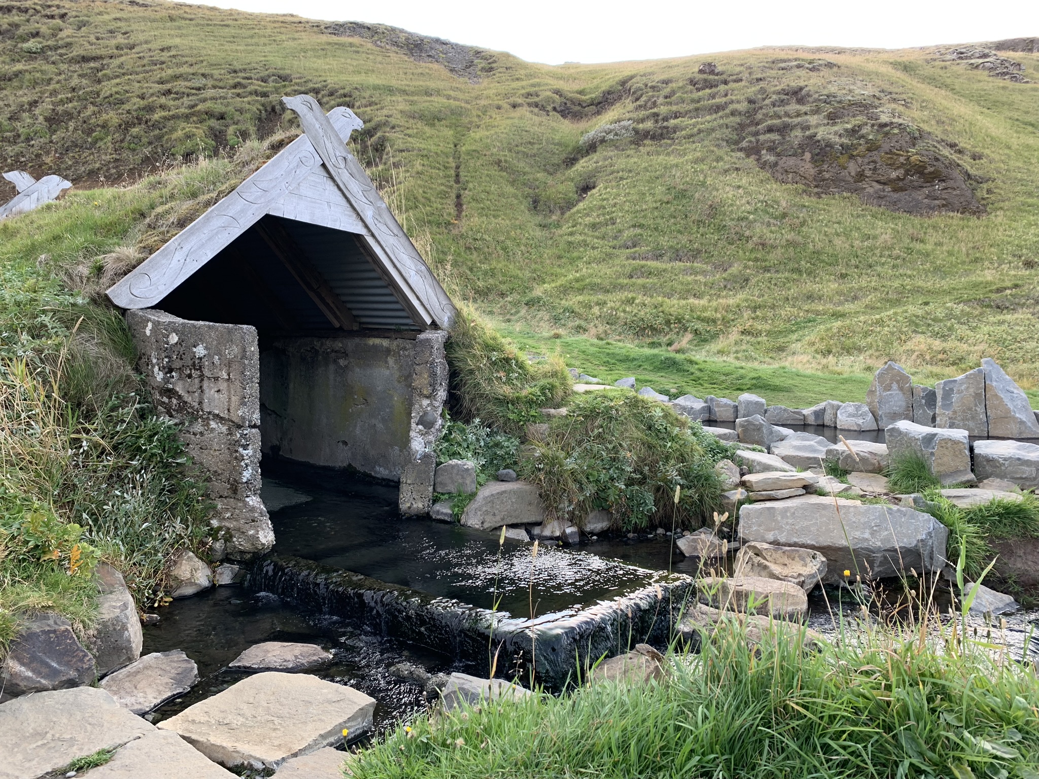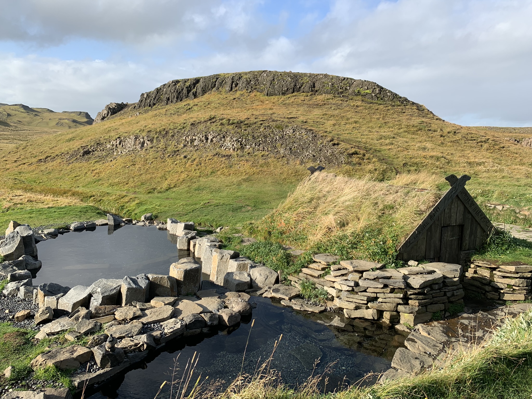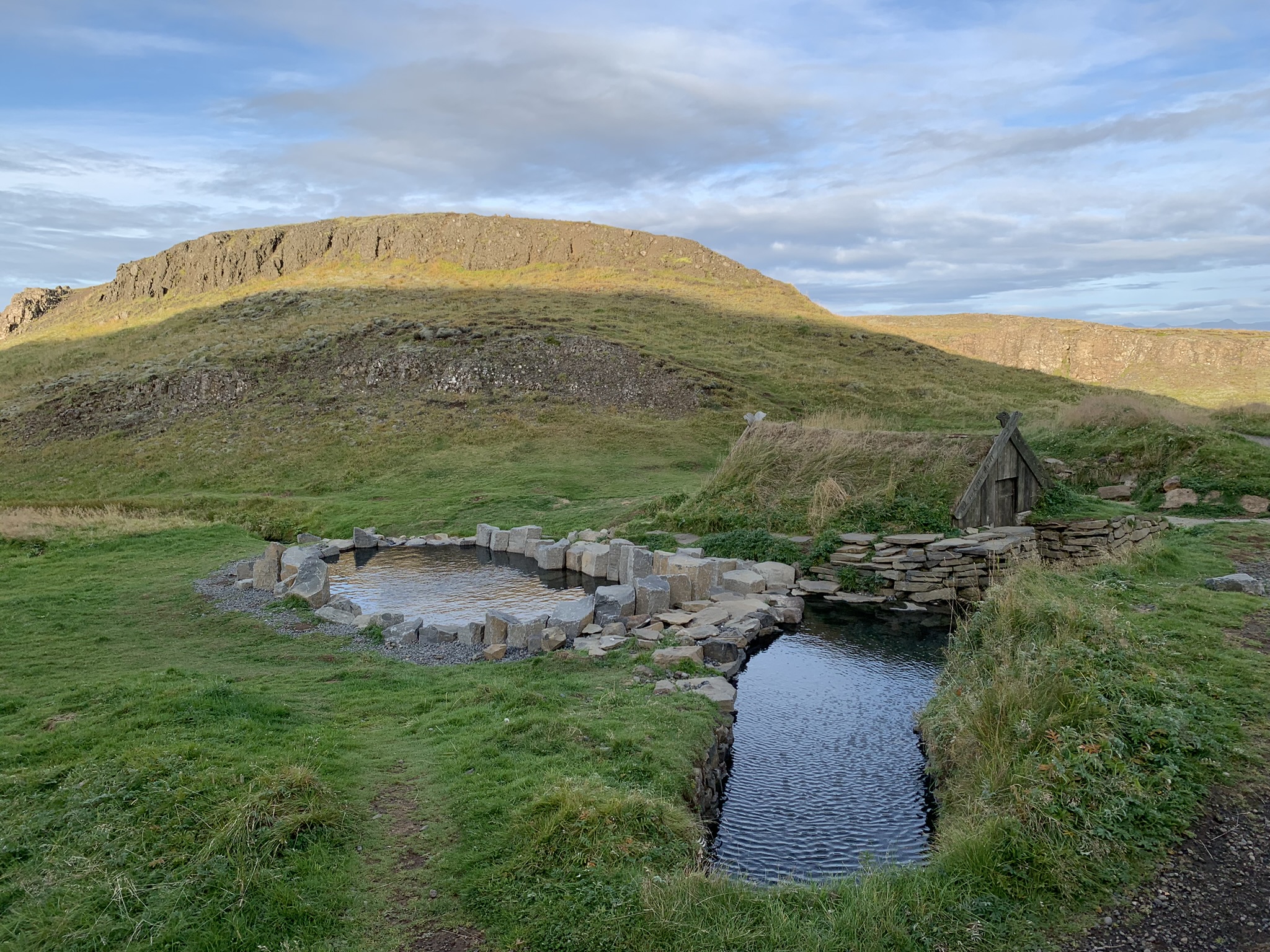 Laundry  The oldest part of the pool in its current form was built around 1890 by Stefán Jónsson (b.1857, d.1917), farmer at Ás and his family. This part of the pool was used for washing laundry and bathing the family members. Sheep  The second pool was built in year 1935 by Steindór Eiríksson (b.1884, d.1967), also a farmer at Ás and grandfather of current owners. That structure was originally conceived for the bathing of sheep. Every two years, all sheep had to be washed to prevent scab, which is a serious disease caused by mite that infests sheep. Bathing of sheep was discontinued in the 1980s. Tourists  The third pool was constructed by the current owners in 2017 to meet the needs of the growing number of visitors eager to experience the uniqueness of this amazing place. In the summer of 2023, this section of the pool underwent a complete renovation, featuring the addition of an outer ring made of natural columnar basalt. The result is a new, larger, deeper, and more beautiful pool that everyone should enjoy.