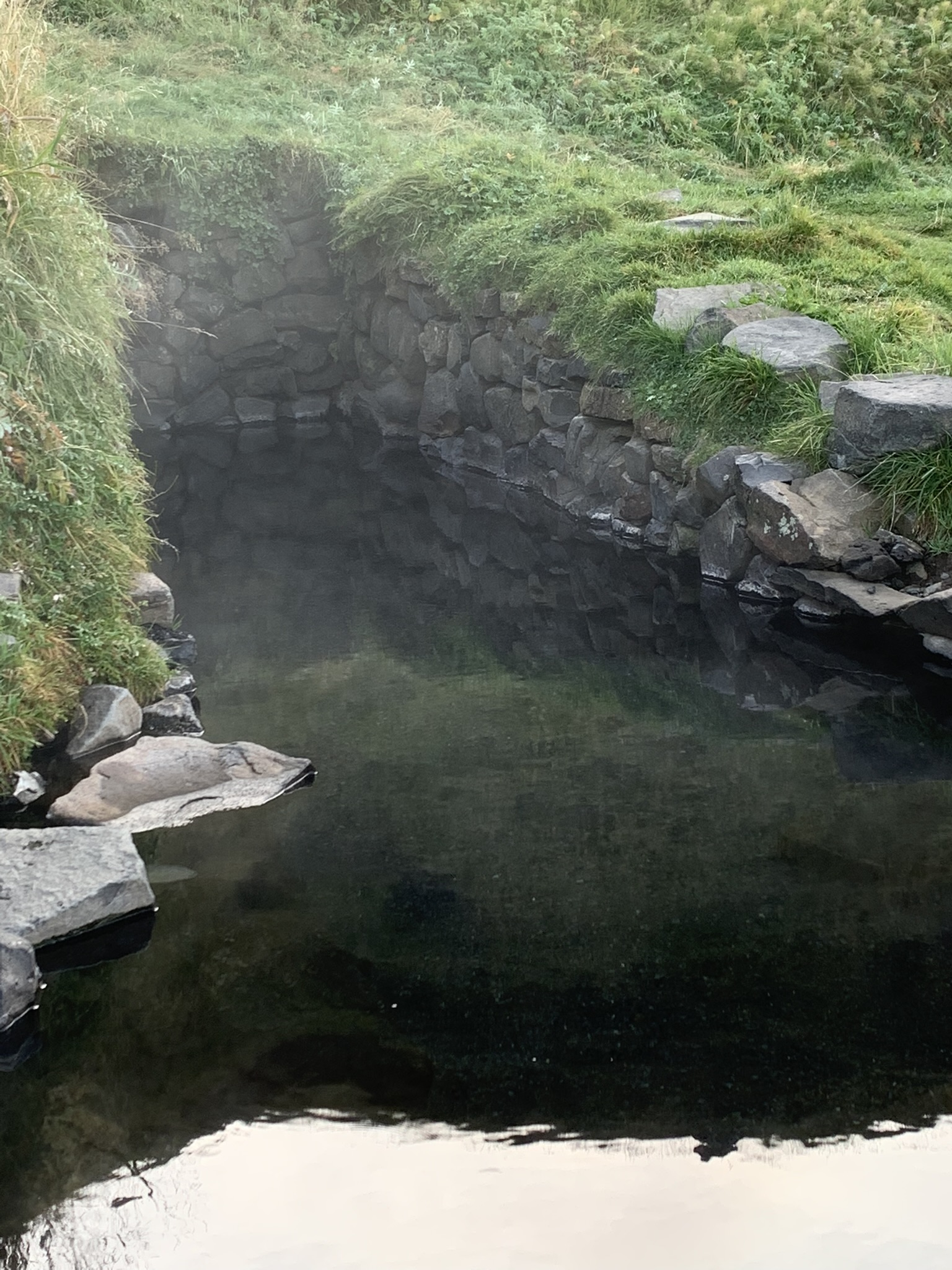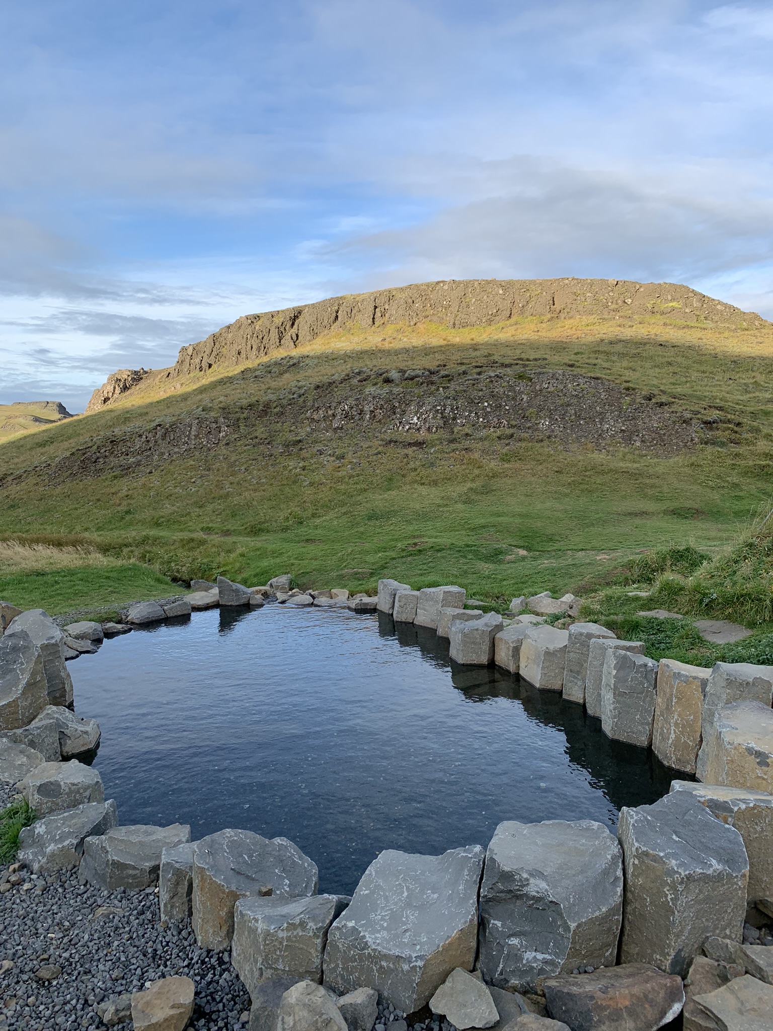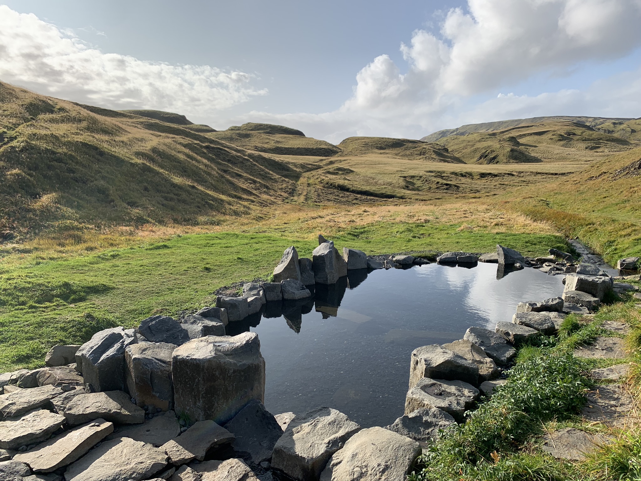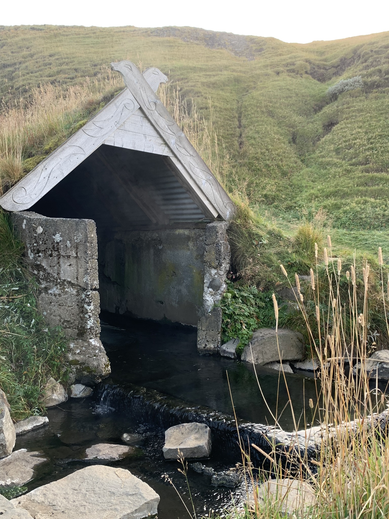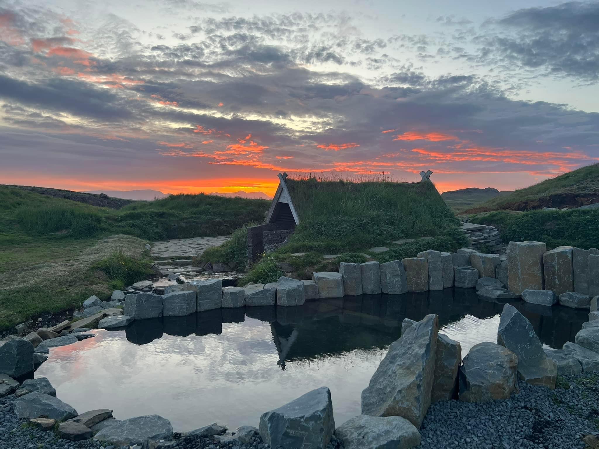 Laundry  The oldest part of the pool in its current form was built around 1890 by Stefán Jónsson (b.1857, d.1917), farmer at Ás and his family. This part of the pool was used for washing laundry and bathing the family members. Sheep  The second pool was built in year 1935 by Steindór Eiríksson (b.1884, d.1967), also a farmer at Ás and grandfather of current owners. That structure was originally conceived for the bathing of sheep. Every two years, all sheep had to be washed to prevent scab, which is a serious disease caused by mite that infests sheep. Bathing of sheep was discontinued in the 1980s. Tourists  The third pool was constructed by the current owners in 2017 to meet the needs of the growing number of visitors eager to experience the uniqueness of this amazing place. In the summer of 2023, this section of the pool underwent a complete renovation, featuring the addition of an outer ring made of natural columnar basalt. The result is a new, larger, deeper, and more beautiful pool that everyone should enjoy.